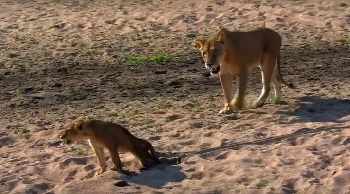 但最终,母狮还是温柔地舔舐了小狮子,随后毅然决然地转身离开。小狮子在母狮身后,拖着受伤的腿,拼命地一步步向前挪动,试图追上母亲远去的身影。